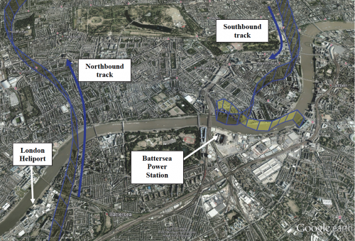 The radar-derived final part of the track of the helicopter on the right and the London Heliport at the lower left (the earlier northbound track towards Elstree is on the left). Reproduced from the Official Report