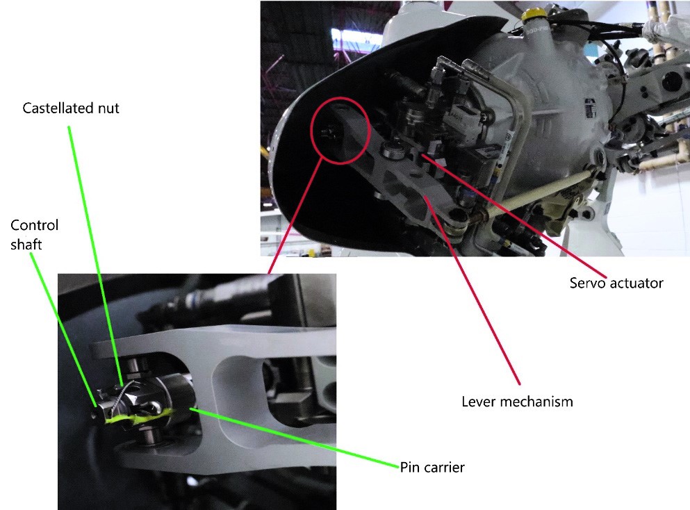 It was concluded that “sufficient force and torque had been applied to the castellated nut on the actuator end of the control shaft to friction-weld it to the pin carrier and to shear the installed split pin”. It was further concluded that the observed condition of the duplex bearing and the increased torque load on the castellated nut that remained on the end of the shaft was consistent with rotation of the tail rotor actuator control shaft. When a yaw control input occurred whilst rotation was taking place, it the led to the shaft ‘unscrewing’ from the nut, which disconnected the shaft from the actuator lever mechanism and caused the nut to become welded to the pin carrier.