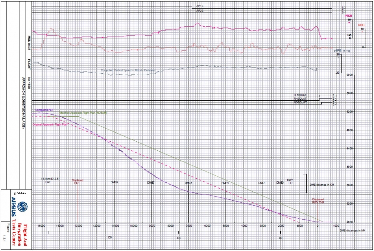 The difference between the vertical profile to the full length runway, the revised vertical profile to the displaced threshold and the vertical profile actually flown is shown in the diagram below prepared by Airbus in support of the Investigation.
