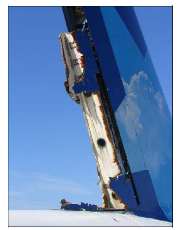 View rearwards from the right of the vertical tail plane showing the remains of the rudder, Source: TSB Canada Report A05F0047