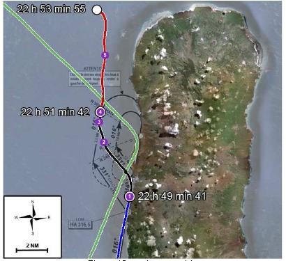 The aircraft ground track on arrival overhead (green) and during final approach (other colours). [Reproduced from the Official Report]