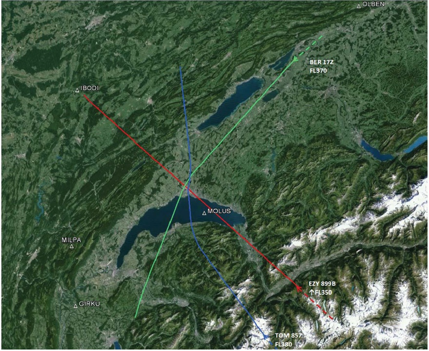 It was established that all three aircraft were on tracks which would be likely to cross in the vicinity of MOLUS - see the diagram below. The EasyJet A319, heading approximately northwest, had checked in with Sector L5 whilst in the climb to FL350 and the controller advised that he would call back with continued climb clearance. The Air Berlin 737-800, heading approximately southwest had checked in with Sector L5 level at FL370. Meanwhile, the Thompson 737-800 had checked in with Sector L6 level at FL380. Three minutes after it had checked in with Sector L5, the EasyJet A319 was re-cleared to FL360 but the instruction was not read back by its flight crew. Almost immediately, it was then incorrectly (and inadvertently) re-cleared to FL380 and a correct read back followed with the setting of the new level on the selected altitude panel in the aircraft observed by the controller on his radar display shortly afterwards.