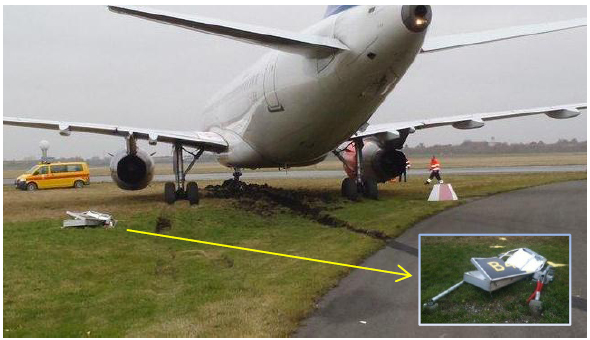 On 21 September 2012, an Airbus A319 being operated SAS on a passenger flight from Oslo to Copenhagen and which had just landed at destination lost directional control in daylight and normal ground visibility and left the paved surface onto grass where a right turn from the rapid entry taxiway (RET) onto an almost-parallel taxiway is required. The nose landing gear became embedded in the soft surface and the aircraft stopped. There were no injuries to the occupants who were subsequently transported to the terminal by bus. The left hand engine ingested parts of some signage hit during the excursion and the cowling and fan were damaged.