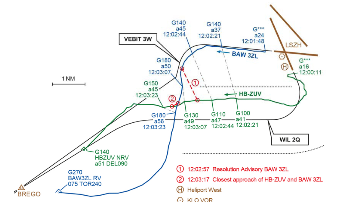 On 29 May 2012, an Airbus A320 (G-EUUD) being operated by British Airways on a scheduled passenger flight (BA713) from Zürich to London Heathrow and an [[A139|Augusta Westland AW 139] (HB-ZUV) being operated by Swiss Jet on a private training flight from Zürich to Les Eplatures came into conflict in Visual Meteorological Conditions (VMC) soon after both had made daylight departures from Zurich under Instrument Flight Rules (IFR) on different SIDs, the AW139 first. The A320 followed the consequent TCAS RA and the AW 139 manoeuvred appropriately in response to the TA which was annuciated on its TAS. As a result, there was no actual risk of collision.