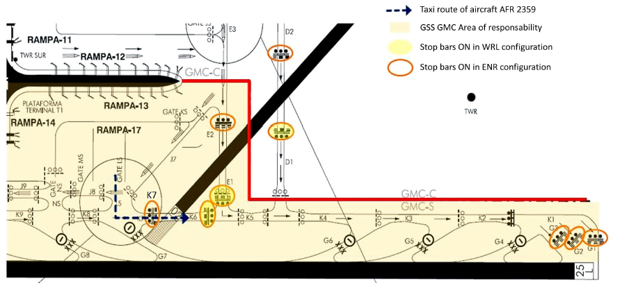 However, it was established that the ground controller had nevertheless cleared the departing A320 to taxi (see the diagram below) from its parking stand 13 to the holding point for departure runway 25L via taxiway ‘K’. The stop bar at K7 was explicitly included in the runway crossing involved which, since under local regulations GND controllers may only issue runway crossing clearances when a runway is inactive, tended, in the absence of contrary evidence and the fact that he had then switched the stop bar lighting a K7 off, to confirm that at the time of issuing the taxi clearance, he had forgotten the earlier briefing on the runway reconfiguration.