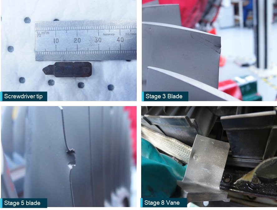- A screwdriver tip, left in a fairing screw or bleed duct, travelled through the high-pressure compressor (HPC) section of the right engine before becoming lodged in the combustion section. This resulted in impact damage to HPC blades and vanes.