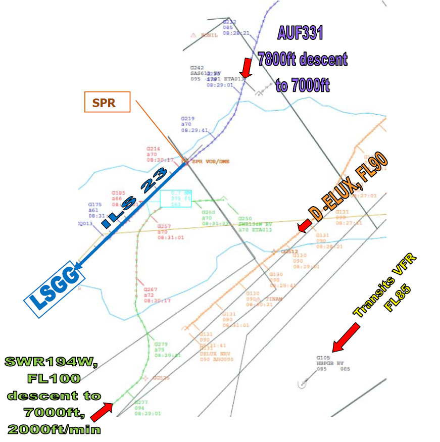 The Cessna Citation was approaching from the north and was in the descent to FL100 and being vectored to join the runway 23 Instrument Landing System (ILS). A single-engined Instrument Flight Rules (IFR) light aircraft was transiting the TMA from the north east to the south west at FL090. The A320 was inbound to Geneva and approaching from the south west in the descent to FL110. The light aircraft was under the control of the Geneva Departure Coordinator, whilst the two inbound aircraft were working Arrival Radar.