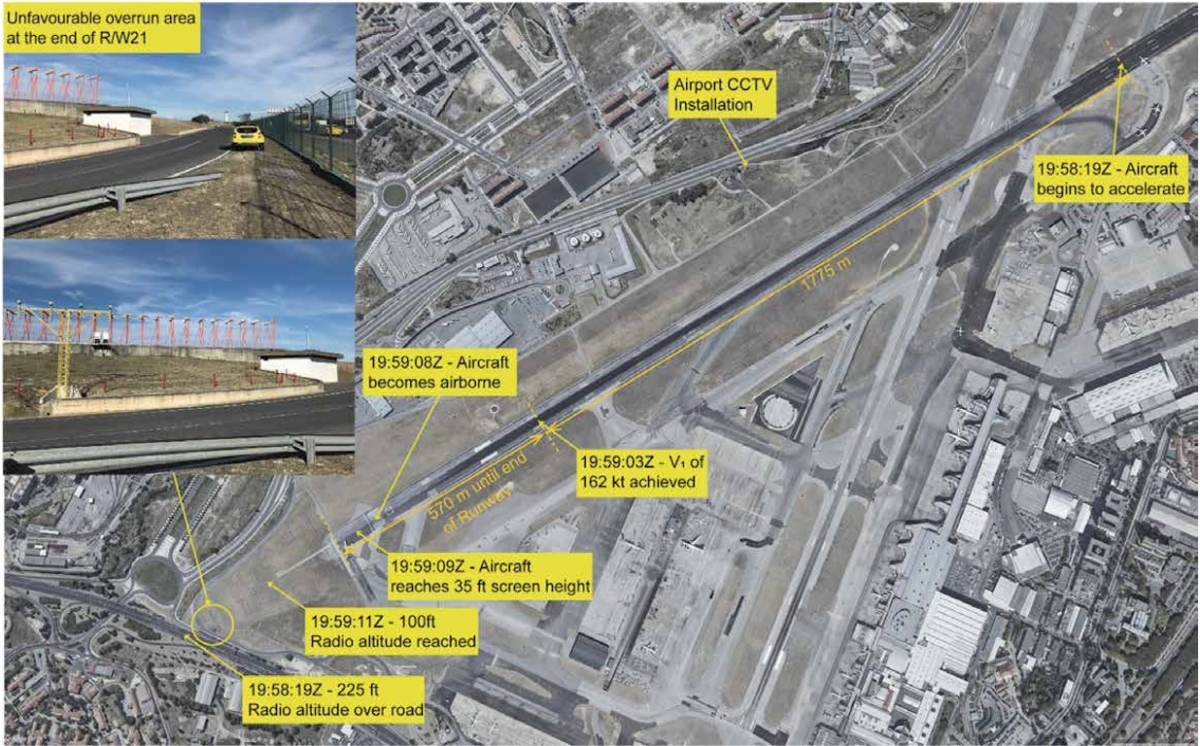 The takeoff with QAR data annotated showing progress along the length of runway used with the overrun area inset. [Reproduced from the Official Report]