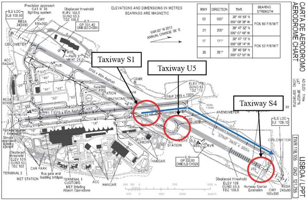 The Lisbon Aerodrome Chart with Taxiways S1, U5 and S4 highlighted (the blue line shows how the full length of runway 21 is reached via taxiways S1/S2/S3/S4). [Reproduced from the Official Report]