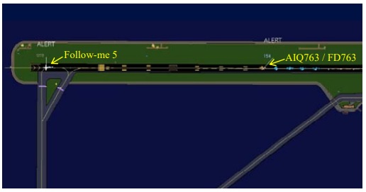 At this point, the positions of the follow-me vehicle and the aircraft were as shown in the first of the recorded radar pictures below with the aircraft still on taxiway C2 and passing taxiway E. Three minutes later, the aircraft became airborne six minutes ahead of the end of its departure slot a little beyond the mid-point of the runway, as shown in the second of the recorded radar pictures below. By this time, the runway inspection, being carried out in the direction of runway operational use, was almost complete and the closest the aircraft came to the vehicle ahead of it whilst on the ground was determined to have been 1,480 metres. The audible conflict alarm triggered by SMR data activated only shortly before this minimum, with the vehicle just past the runway 16 displaced threshold.