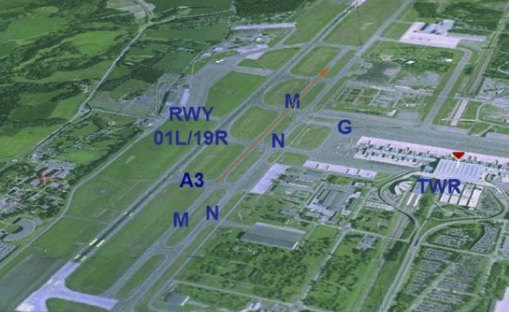 An Investigation was carried out by AIBN. The diagram below shows the position from which the incident aircraft taxied ( a solid red triangle) via taxiways ‘G’ and ‘N’ for departure from Runway 01L at A3 and the orange line indicates where the aircraft took off northbound on taxiway M after receiving take off clearance for Runway 01L whilst taxiing.