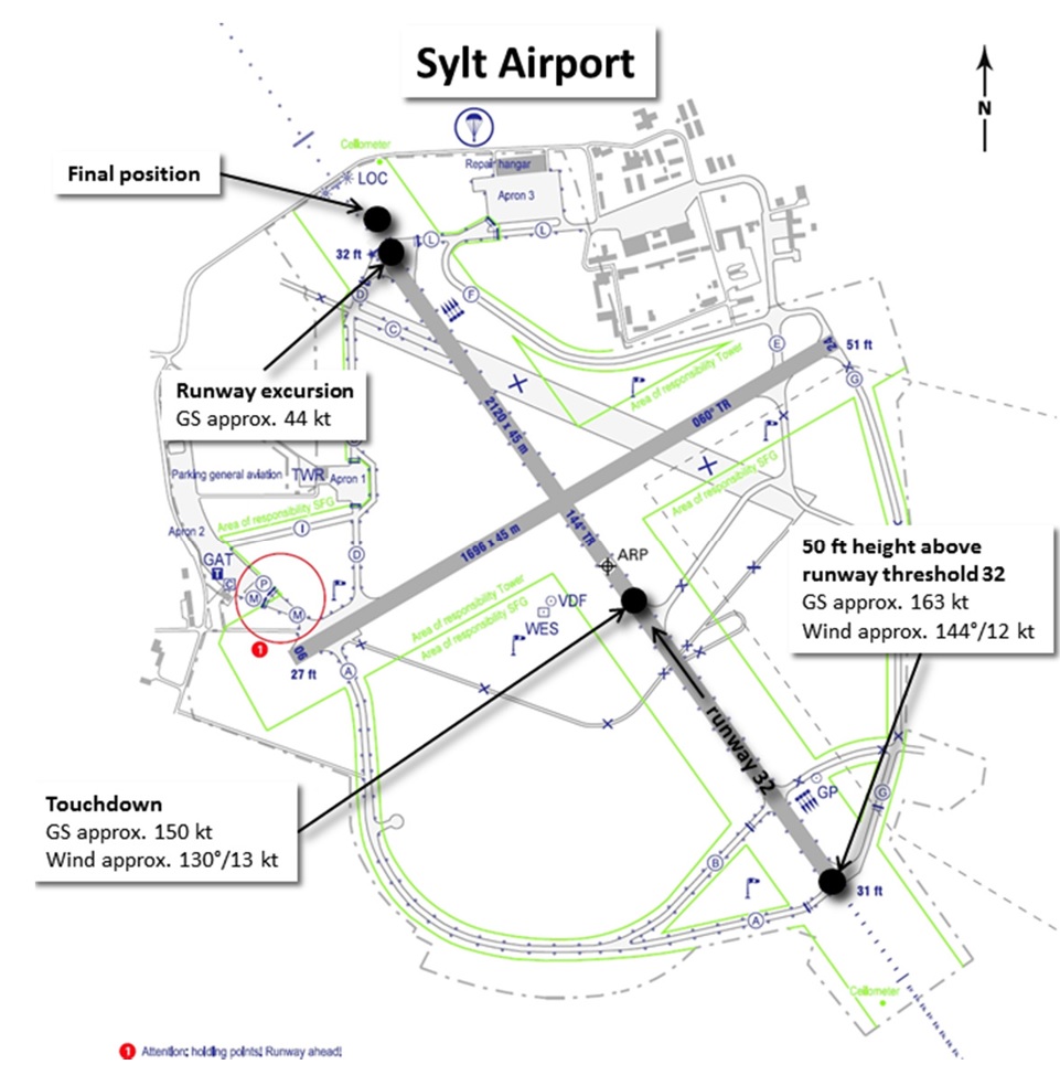 The Sylt Aerodrome Diagram annotated with data derived from analysis of FDR data. [Reproduced from the Official Report]