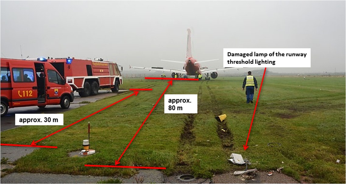 On 30 September 2017, an Airbus A320 touched down late after an ILS approach to runway 32 at Sylt with a significant tailwind component being reported and failed to stop before overrunning the end of the runway and subsequently stopped on grass 80 metres beyond it. The Investigation noted that the calculated required landing distance was close to the landing distance available, the actual approach speed was 20 knots above the calculated one and that the aircraft had floated in the flare above a wet runway. It was concluded that the runway excursion was attributable to non-performance of a go-around.