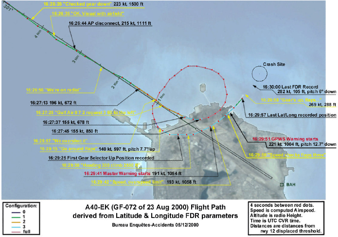 A320 trajectory with selected FDR, CVR, and ATC communication excerpts (reproduced from the Official Report). Click on image to enlarge