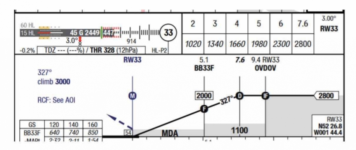 The Investigation found that the proprietary approach plates provided by the aircraft operator for both procedures involved showed a slightly different initial vertical profile for both runway 33 non-precision approaches to the corresponding UK AIP plates which should be the basis for all derived presentations. The AIP RNAV plate, which ATC would refer to and expect to be consistent with the plates used by pilots, shows a descent to 2000 feet beginning at 9.4 nm then level flight at 2000 feet until the final descent begins at 5.1 nm (the FAF) whereas the RNAV plate used by the pilots shows level flight at 2,800 feet from 9.4 nm followed by a continuous descent beginning at 7.6 nm.