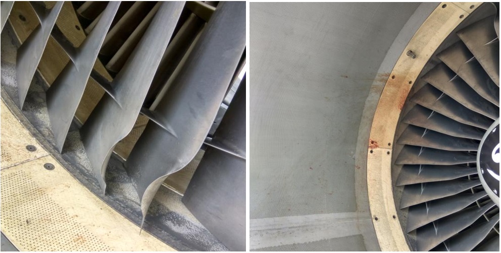 Number 2 engine fan blade damage (left) and bird blood stains (right). [Reproduced from the Official Report]