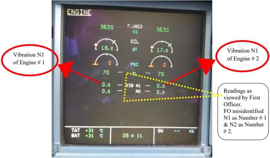 Once safely climbing, the First Officer called “engine vibration no 1 out of limits”, having mixed engine no 1 with N1 on the lower ECAM display (see the illustration below). The Captain did not confirm this by inspection and as the aircraft approached 2200 feet QNH (the Delhi ARP elevation in 777 feet) he almost immediately selected the thrust on serviceable engine number 1 to Idle and increased the thrust on unserviceable engine 2 to CLIMB and then to TO/GA. At 2700 feet QNH, engine 1 was shutdown and the crew declared an emergency to ATC requesting an immediate return. Airspeed at this point was recorded as 152 KCAS and the previously engaged AP disconnected due to turbulent conditions. ATC responded accepting the request and telling the crew to stop climb at 3000 feet - the aircraft was levelled at 3300 feet.