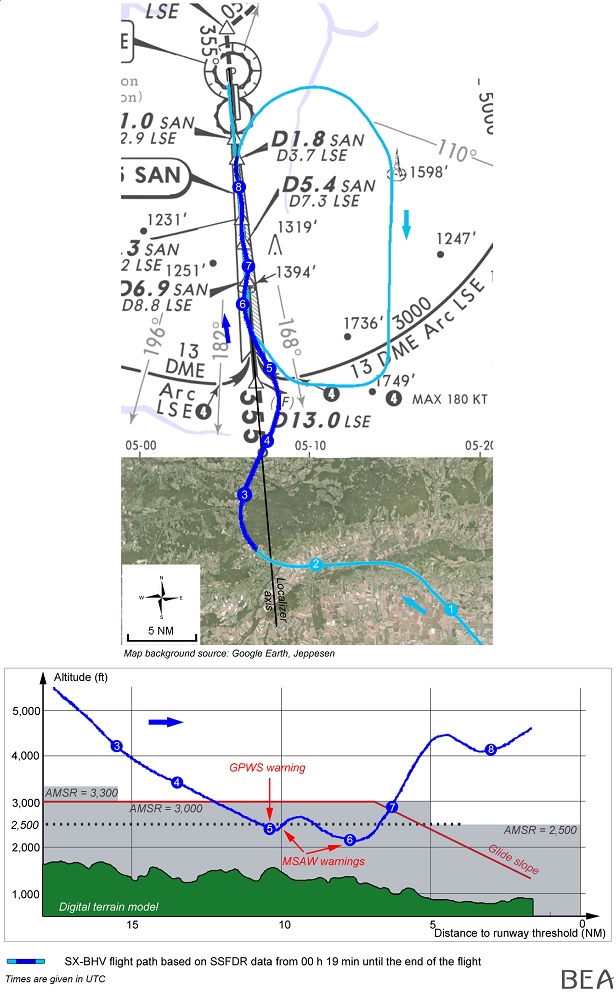 A few seconds later, with the aircraft approaching an altitude of 2500 feet, the controller, in response to an MSAW activation, called "you maintain 2,500 ft, you are too low, you are below the glide". It was considered that in response, the Commander had probably tried to stabilise the aircraft at 2500 feet. Nose-down inputs were maintained for about twenty seconds and thrust levers were moved to 'CLIMB' as the crew "was waiting for the controller’s instruction to climb". Airspeed began to increase sharply and descent re-commenced. When the aircraft reached 900 feet agl with a speed of 320 knots (position 6 on the diagram) the thrust levers were set to 'IDLE' as a second MSAW activation occurred and the controller intervened with "…check your altitude immediately, you are too low".