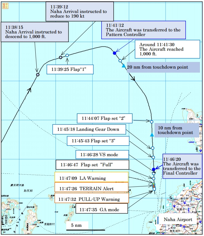 It was established that the flight had been uneventful until nearing Naha when the crew requested that their previously-briefed VOR approach to runway 18 should be changed to a PAR procedure to the same runway due to deteriorating weather conditions. This request was approved by the Arrival controller and whilst on a wide right hand downwind leg for runway 18 (see the annotated aircraft ground track Illustration below), the aircraft was instructed to descend to 1000 feet. Then, having been turned right onto the beginning of a radar base leg, it was instructed to reduce speed to 190 KIAS and the crew set Flaps 1. The aircraft was transferred to the "Pattern Controller" who advised that the visibility was 4,000 metres and 1,000 feet was reached 20 nm from touchdown. This unusually early descent was routine and was due to the need for approach traffic to remain clear of operations at the USAF Kadena Air Base and the USMC Futenma Air Station, both northeast of Naha and both of which have extended runway centrelines which cross the extended centreline of Naha runway 18.