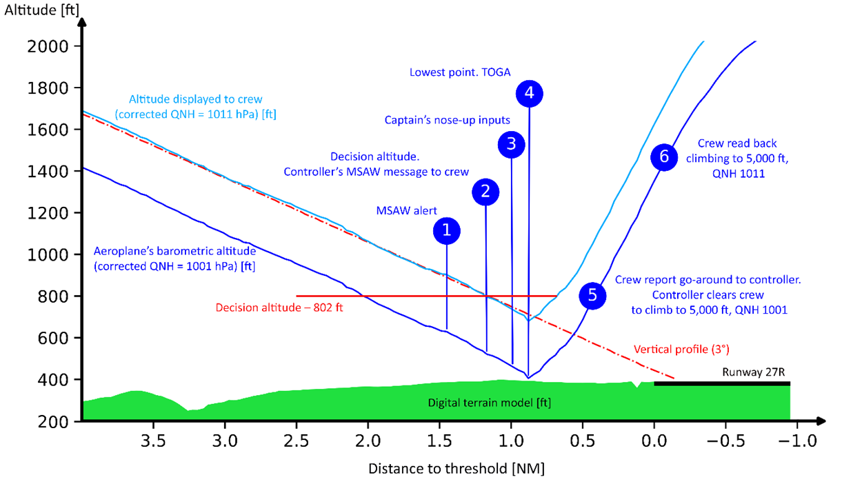 - Overall, following the initial failure of ATC to pass the correct QNH to the flight prior to the first approach, the investigation discovered after an analysis of air traffic controller activity that despite “a normal operation context in terms of traffic, manning of positions and weather conditions, and in the absence of any malfunction, a large number of air traffic control errors were observed over a short period of time” and “had consequences of varying degrees."
