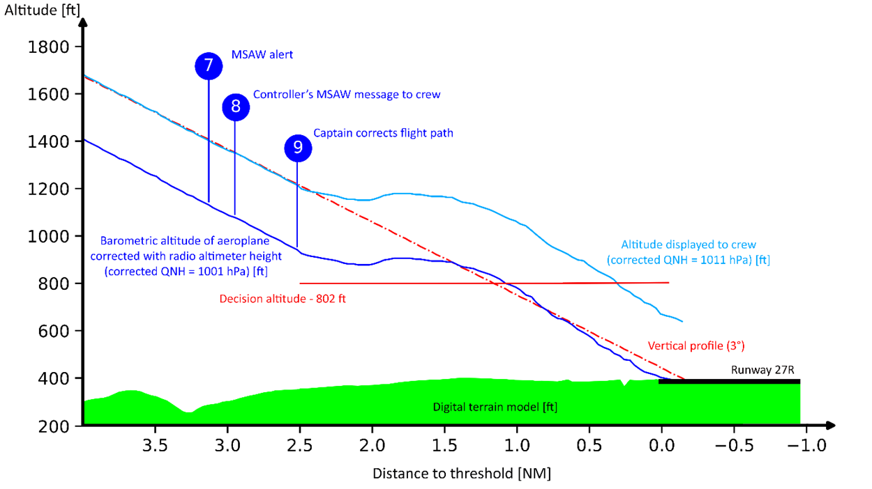 Although the second approach was again flown below the correct profile because the incorrect QNH was still set, it was again ‘stabilised’ and flown at the correct VAPP of 140 KCAS with the AP engaged. The correct and as-flown vertical profiles for this second approach are as shown in the illustration below. Position 7 indicates the new MSAW activation in the North Tower with 3.1 nm from the runway, which the controller advised to the flight four seconds later. The crew indicated that although they had heard this call, they had not understood the reason for it, and the first officer had replied that they were on the correct flight path (which at that time they were not). However, within a few seconds, the aircraft had emerged from cloud allowing the crew to see the runway and visually correct their flight path onto the correct approach path. An uneventful landing then followed.