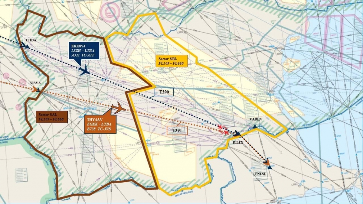 It was found that the 56 year-old A321 Captain had 12,150 total flying hours and the 33 year-old A321 First Officer had only 337 total flying hours. The 43 year-old B737 Captain had 2,954 total flying hours and the 40 year-old B737 First Officer had 2,437 total flying hours. No aircraft type experience was recorded for any of the pilots. It was established that both aircraft were heading towards Istanbul and cleared to route through Bulgarian airspace towards the Bulgarian/Turkish waypoint at RILEX with similar estimates at FL370 on track T391 (the Boeing 737) and FL350 on track T390 (the Airbus A321) - see the illustration below.
