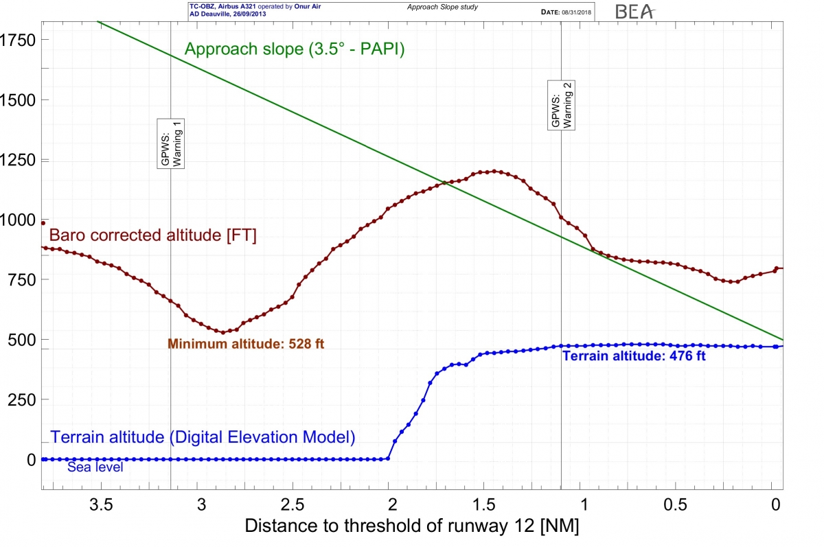 The event was not reported to the French Civil Aviation Accident Investigation Agency but the next morning, the French Aviation Police (GTA) informed the BEA that a witness had seen an aircraft flying low over the sea the previous day. Examination of recorded radar data appeared to confirm such an occurrence and that it had involved the Onur A321. An Investigation was commenced the following day and after sight of the aircraft’s QAR data received after a request to the Turkish authorities eleven days after the event, the “seriousness of the incident was confirmed”. Non-reporting immediately after the occurrence resulted in relevant CVR data being overwritten. Data within the Mark 5 EGPWS memory was also available. Both pilots made statements to their airline and the Captain also submitted a Statement to the Investigation. The First Officer “claimed his retirement rights in the days following the incident (and) he refused to participate in the interviews proposed by the BEA”.