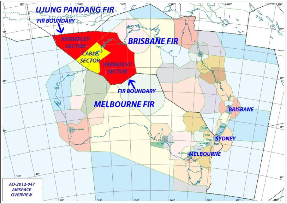 The Kimberley (KIY) and Cable (CBL) sectors where the Temporary Reserved Area was implemented and TIBA procedures notified showing the adjacent FIRs (reproduced from the Official Report)