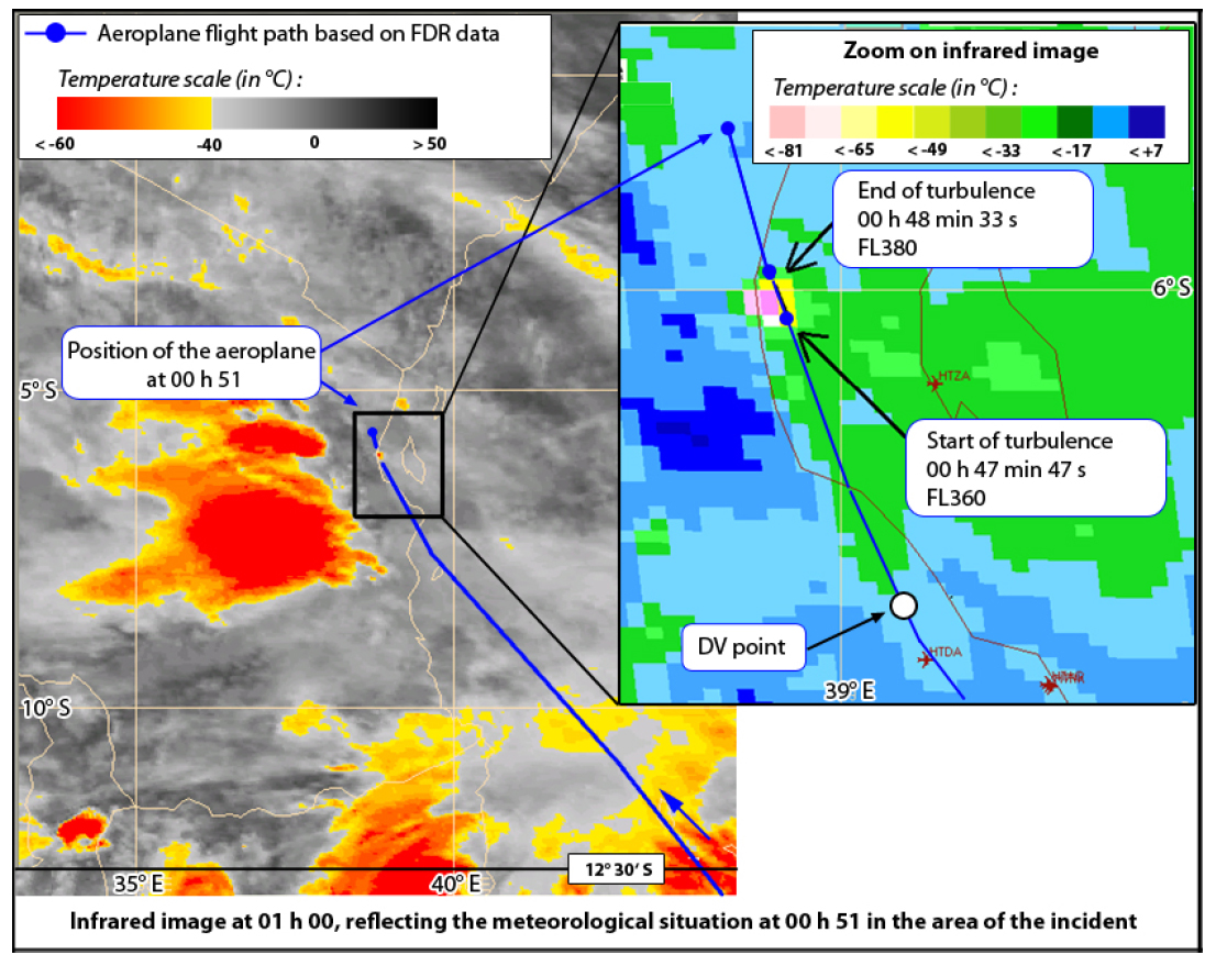 Analysis of the prevailing meteorological situation led to the conclusion that the turbulence had been a consequence of penetrating an isolated thunderstorm cell which had developed particularly rapidly and that "strong updraughts and severe turbulence" were to be expected because of the dynamics rather than the size of the cell. Satellite images recorded soon after the event are shown below.