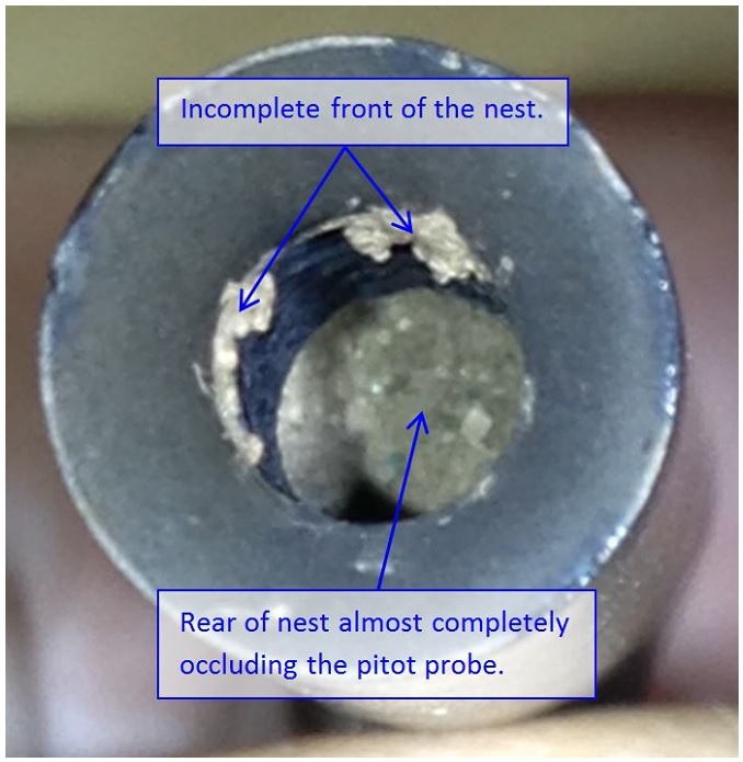 - The Captain’s pitot probe was almost completely obstructed by an insect nest, consistent with mud wasp residue, during the 2 hour and 3 minute period while the aircraft was in transit on the ground at Brisbane.