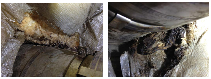 Insulation blanket damage (left picture) adjacent to the surface of the APU bleed air duct (right picture) - reproduced from the Official Report