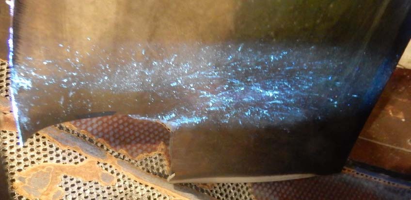 - The same UV light inspection also showed that the blade with the missing tip had organic debris in the area near the point of separation and there was also organic debris on the blade-tip that had been recovered at Brisbane (see the first illustration below). DNA analysis of samples from both these areas also confirmed masked lapwing as the source.