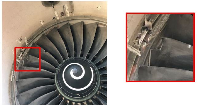 - As per the illustration, blade damage was also found on one of the blades next to the tip-loss blade which was consistent with hard body impact but laboratory analysis did not identify that any foreign object had impacted that blade.