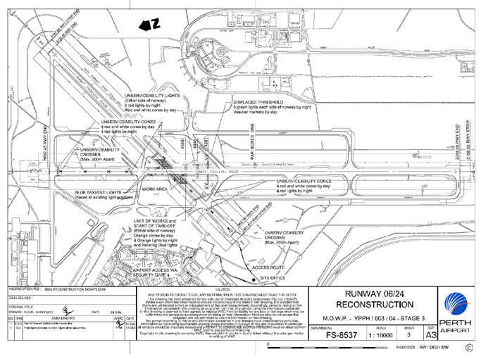 The displaced threshold was required to facilitate the reconstruction of runway 06/24 and taxiway intersections at Perth airport (see the diagram below). Prior to commencement of the programme of work, the airport operator had issued a description of the intended works which was distributed to all operators using Perth including the operator of the incident aircraft. The work notified included the reconstruction of the runway 03/21 intersection with runway 06/24 with work to be scheduled between 0130 and 0930 on each working day which would involve the threshold of runway 21 being displaced by 1331 metres to the south and the Instrument Landing System (ILS) GS for runway 21 being unavailable. The effect of this displacement of the landing threshold would be to reduce the available runway length by almost 40%. A temporary precision approach path indicator (Visual Approach Slope Indicator Systems) would be installed on the eastern side of runway 21 to provide visual guidance for a 3-degree approach to the new touchdown zone taking account of the position of the displaced threshold. It was stated that this temporary PAPI would be situated 395 metres to the south of the temporary threshold. It was further stated that “visual ground aids associated with the works would be supplied, marked, and located” in accordance with the requirements of the Aerodromes section of the Manual of Standards of the Safety Regulator, the Civil Aviation Safety Authority (CASA).