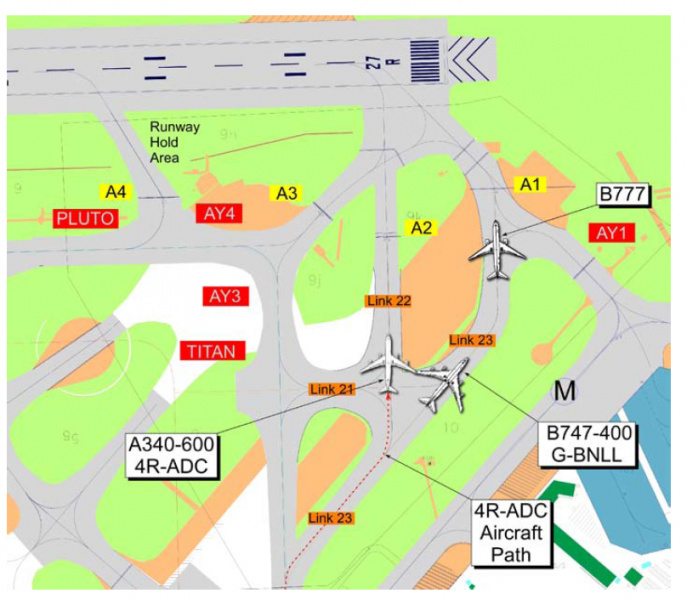 An Investigation was carried out by the UK AAIB. This noted that the Boeing 747-400 had stopped well clear of a stationary Boeing 777 ahead to preclude the risk of damaging jet blast and to avoid stopping in the turn ahead, this preventing stress on the landing gear and avoiding the use of excessive thrust when taxiing was resumed. The A340 had been cleared along the taxiway past the Boeing 747 and had assumed that the illuminated green centerline lights indicated that a clear route was available.