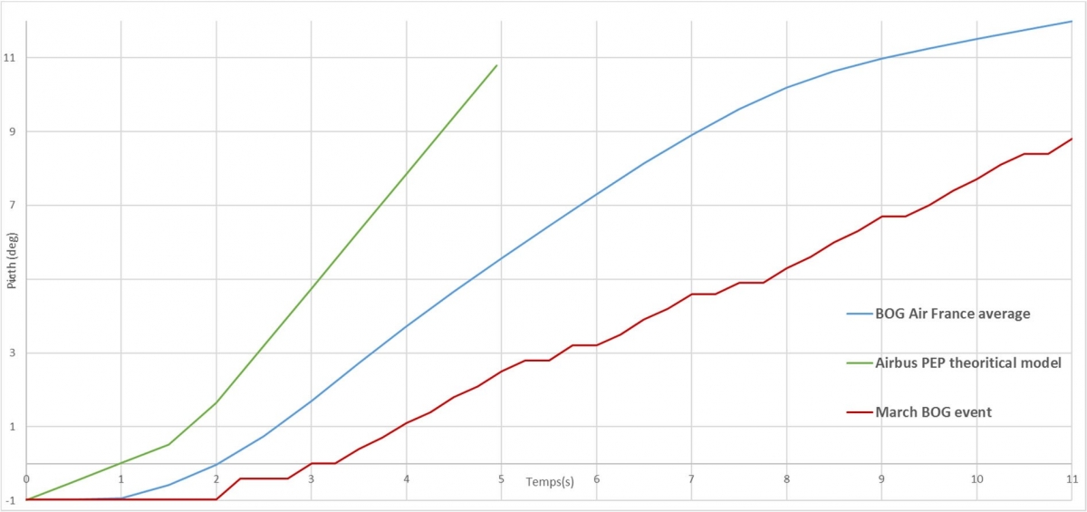 A comparison of average rotation rates achieved during Bogota takeoffs by Air France and Lufthansa showed that these were very similar - around 1.8° per second in both operators. In respect of the investigated takeoff, it was noted that an initial input of 2/3 sidestick pitch up then held “would not have permitted the takeoff performance expected by the AFM to be reached”. The Investigation found that Airbus had been aware of this difference between A330 sidestick deflections being made during takeoff in normal operations and those which would be needed to reach the certified performance of the aircraft and had “reiterated that [...] a continuous rotation rate of 3° per second is best adapted to takeoff performance while avoiding tailstrike risks”.