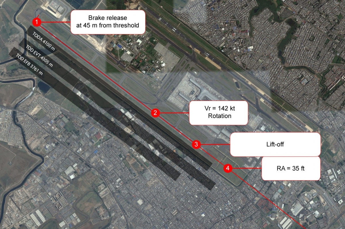 Takeoff clearance was given with a spot wind of 300° at 4 knots which corresponded to the wind velocity entered into the EFB used for performance calculation. One minute after brake release, the PF initiated the rotation at the calculated VR at which point the aircraft was 2,760 metres from the 13R threshold. Two seconds after initiation of rotation, sidestick deflection was recorded at 9° nose up (57% of the maximum). The nose-up input was then recorded as having “oscillated between 5° and 11° for the duration of the rotation". Eleven seconds after the beginning of rotation, the main landing gear was recorded as decompressed when the aeroplane was just 140 metres from the opposite runway threshold with the aircraft pitch attitude at 8.5°. One second later, the end of the runway was crossed at 6 feet agl at 155 KCAS - V2+6 knots after which the end of the clearway was crossed at 20 feet agl at 158 KCAS - V2+9 knots. The first obstacle on the climb out, the 20 feet high ILS LOC antenna, was cleared by 12 feet at 159 KCAS - V2+10 knots. At this point, the pitch attitude was 12.3° and the vertical speed “close to zero”. The elapsed time between the first nose-up input at VR and the aircraft reaching its target pitch attitude of 12.5° was 15 seconds and 35 feet agl (i.e. the TODA) was reached some 4,350 metres from the beginning of runway 13R. As the takeoff continued, the aircraft overflew obstacles in the second segment “with margins greater than the regulatory minimums”.