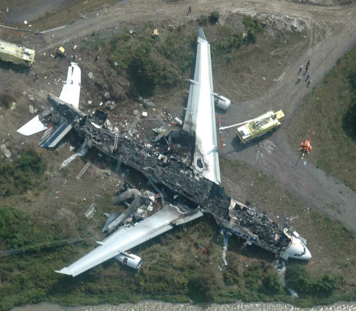 On 2 August 2005, an Airbus A340-300 being operated by Air France on a scheduled passenger flight from Paris CDG to Toronto landed at destination in daylight during a thunderstorm and failed to stop before reaching the end of the runway. It exited the airport perimeter and crossed a main road before ending up in a ravine approximately 300 m beyond the end of the runway. Although an intense post-crash fire began immediately and smoke began to enter the cabin, all 309 occupants were able to evacuate before the fire took significant hold. The fire eventually consumed most of the upper fuselage, the adjacent wing sections and the vertical stabilizer.
