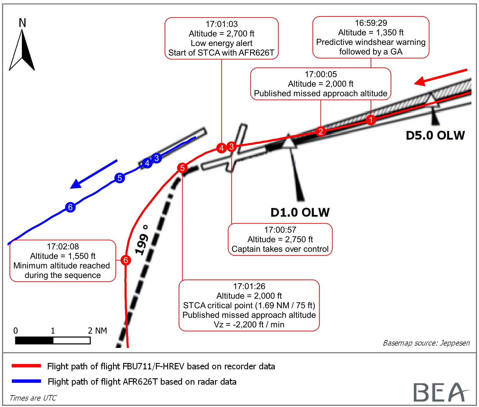 Altitude acquisition (ALT*) was annunciated passing 1,750 feet, and following the Captain’s call of “SPEED, ALT STAR”, the First Officer was thereby prompted to move the thrust levers to the ‘CL’ detent. Recognising that the aircraft was going to exceed the selected altitude, the Captain and the Relief Pilot both reminded the First Officer to stabilise the aeroplane at 2,000 feet but he did not react. Just over half a minute after the windshear warning had prompted commencement of the go around, the aircraft continued climbing through 2000 feet (point 2 on the illustration below) at 1,800 fpm and 167 KCAS. The flaps were retracted to ‘CONF1’ and FD command bars indicated an increased nose-down input but pitch remained stable at around 8° nose-up. Six seconds after flying through 2,000 feet, the altitude alert began to sound continuously and the final stage of flap was retracted around 10 seconds later. The climb above 2000 feet continued as the aircraft overflew the runway 25 threshold.