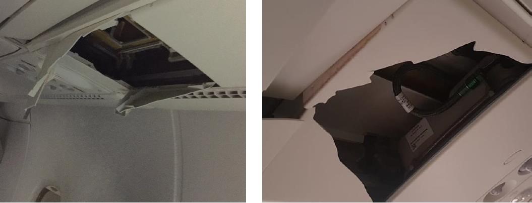 Damage to the main deck aft cabin ceiling panels caused by occupant impact. [Reproduced from the Official Report]