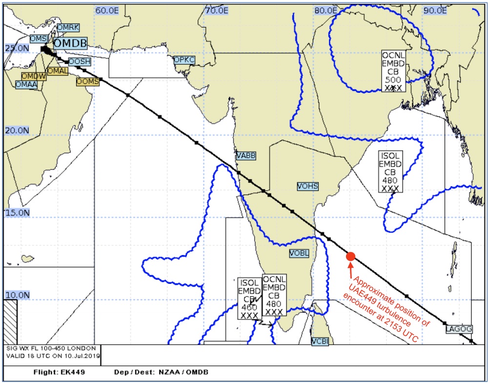 Although it was not possible to obtain satellite imagery of the weather system which had led to the turbulence, a comparison of the forecast provided to the crew prior to departure and a later one showed that although the pre-departure forecast (see the illustration below) had envisaged that the flight track across the Bay of Bengal would pass between two areas of occasional or isolated embedded cumulonimbus, by the time the flight got there, the area of convergence left of track on the pre departure forecast had been moving east at approximately 15 knots and had moved sufficiently for the track to pass through it where the severe turbulence had occurred. It also appeared likely that at about the position where the turbulence occurred, the flight would have been in the vicinity of a 120 knot easterly Jetstream expected to occur between FL 420 and FL 550. However, no related SIGMETS had been issued.