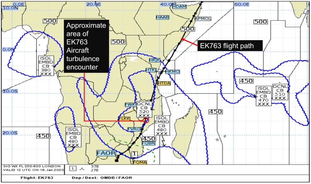 - Route Weather Forecast - The turbulence detection function of the weather radar indicated that there were several wet turbulence areas as the aircraft continued over Mozambique and Malawi confirming the accuracy of the convective weather forecast on the OFP significant weather chart.