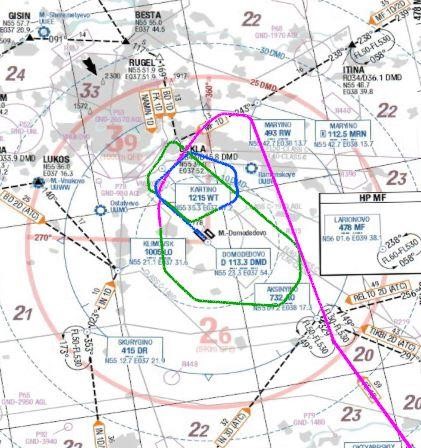 Whilst approaching Domodedovo from the southeast on track towards the ‘AO’ NDB (see the illustration above) in CAVOK (cloud and visibility OK) conditions, ATC began providing radar vectors towards the Runway 14R ILS (see the illustration below) leading direct to the ILS final approach point (FAP) (point ‘P’ on the ILS14R approach chart below) on a track approximately parallel to a line linking the initial approach fix (IAF) at 'AM TAM' and the ILS IF but 2.9 nm closer to the runway. To facilitate establishing on the ILS LLZ at that range, the controller offered a descent to 500 metres QFE (equivalent to 2230 feet QNH) at the flight crew’s discretion which the crew accepted and set 2300 feet as the target altitude. ATC instructed the flight to establish on the ILS LLZ from the present heading 220° maintaining 170 KIAS for as long as possible to avoid minimum separation from following traffic.