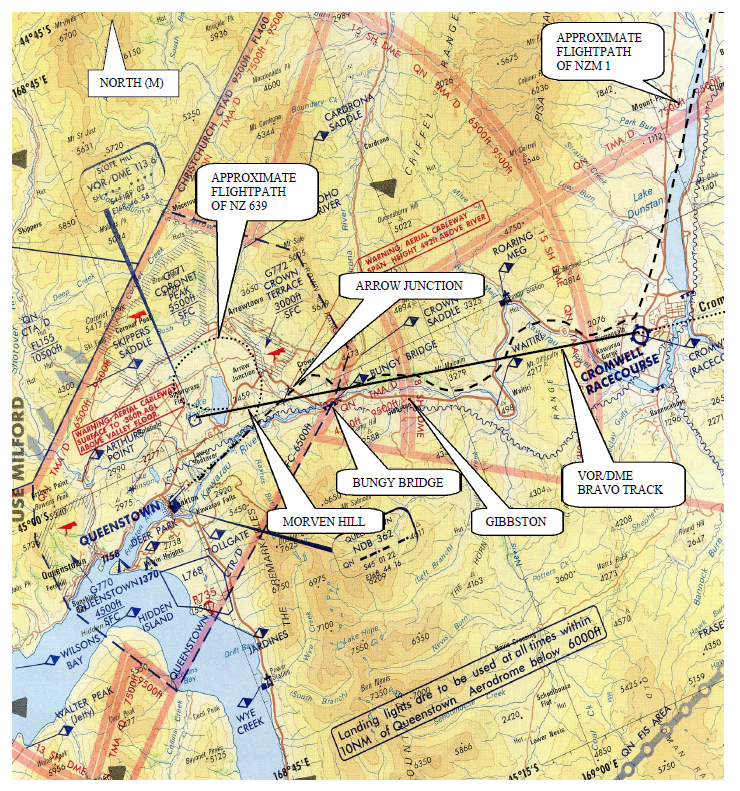 An Investigation was carried out by the New Zealand Transport Accident Investigation Commission (TAIC). An annotated terrain chart taken from the official report is shown below to aid an understanding of the conflict which occurred.