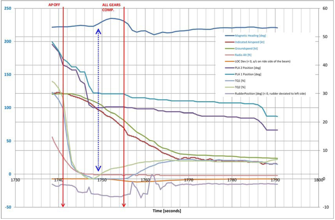 As aircraft ground speed decreased, the Captain used the Nose Wheel Steering to return the aircraft to the paved surface, reduced Power to Ground Idle and “continued to taxi normally in accordance with ATC instructions”. In respect of the fact that there was no positive move to select Ground Idle (GI) once the aircraft had landed with Flight Idle (FI) selected (see the FDR trace below), the aircraft manufacturer was noted to have commented that “it is preferable to go from FI to GI at reasonable speed (within 2 or 3s) and not to stay too long in (an) intermediate position”.