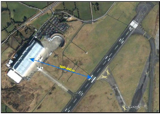 The Investigation established that the prevailing cross wind conditions did not exceed the limits established by the operator which were slightly more restrictive than those given by the aircraft manufacturer. However, the potential effect of additional turbulence generated by a large six-bay hanger situated 450 metres from the runway 24 TDZ with the prevailing wind direction (see below) was considered. It was noted that the required ATC caution about this turbulence had been given and that, like all Aer Arann flight crew, the accident aircraft pilots were aware of it. A technical assessment undertaken in 1996 following reports of turbulence resulting from the construction of this hangar was found to have concluded that there were only “slight wind velocity deficits and turbulence intensity changes along the runway close to the hangar when the approach wind is blowing almost normal to the rear face of the hangar." However, the author of the Report, when contacted by the Investigation “stated that a neutral air mass had been considered and that no allowance was made for atmospheric instability” which would typically - and had at the time of these approaches - prevailed. A study of the effect of building-generated turbulence on aircraft making an approach published by the Dutch NLR in 2010 was also consulted. However, after considering these sources against the available evidence from the investigated event, it was stated that “the Investigation notes from the DFDR readouts that the gains and losses of IAS, though significant, were of short term duration, typically over one or two seconds, and is satisfied that the longer term average airspeed changes were due to engine power changes and not wind shear”.