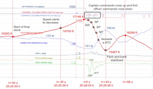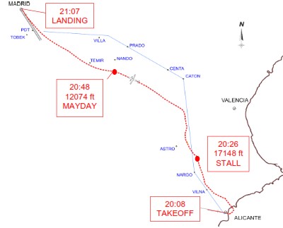 CVR data available from just after the MAYDAY declaration confirmed that by then there were three people on the flight deck, the two pilots and an Air Europa Captain who was positioning on the service and had gone into the flight deck at the operating Captain’s request after the stall recovery. Subjects of conversation during the initial part of the descent included the aircraft’s continued vibrations and “concern about performance when they had to lower the flaps for landing”, the later leading to the decision to make a flapless approach to land on what would be a long runway relative to that required. The Senior Cabin Crew Member ( SCCM) also entered to report that a passenger was going to be administered oxygen. Later, the First Officer “is heard preparing the manoeuvre […] confirming that the speed would be 130 knots” - the correct speed was actually 135 knots.
