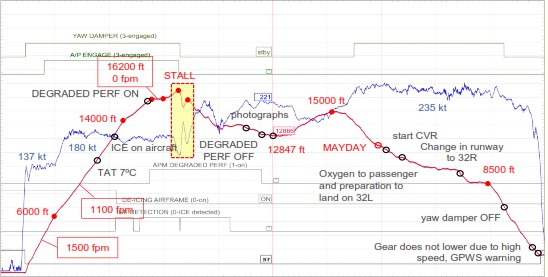 • Flight in severe icing conditions. The fact that three minutes before stalling, the aircraft was unable to continue climbing and that the airspeed was beginning to drop were “clear indications” which were described as such in the applicable procedures, that the climb performance of the aircraft was degrading. Explicit indications that ice was building up on the airframe (the ICING LIGHT was on) and that the drag was increasing (the DEGRADED PERF alert was on) were also available. Both demonstrated that the aircraft climb performance was degrading “and that the aircraft was flying in uncertified conditions”.