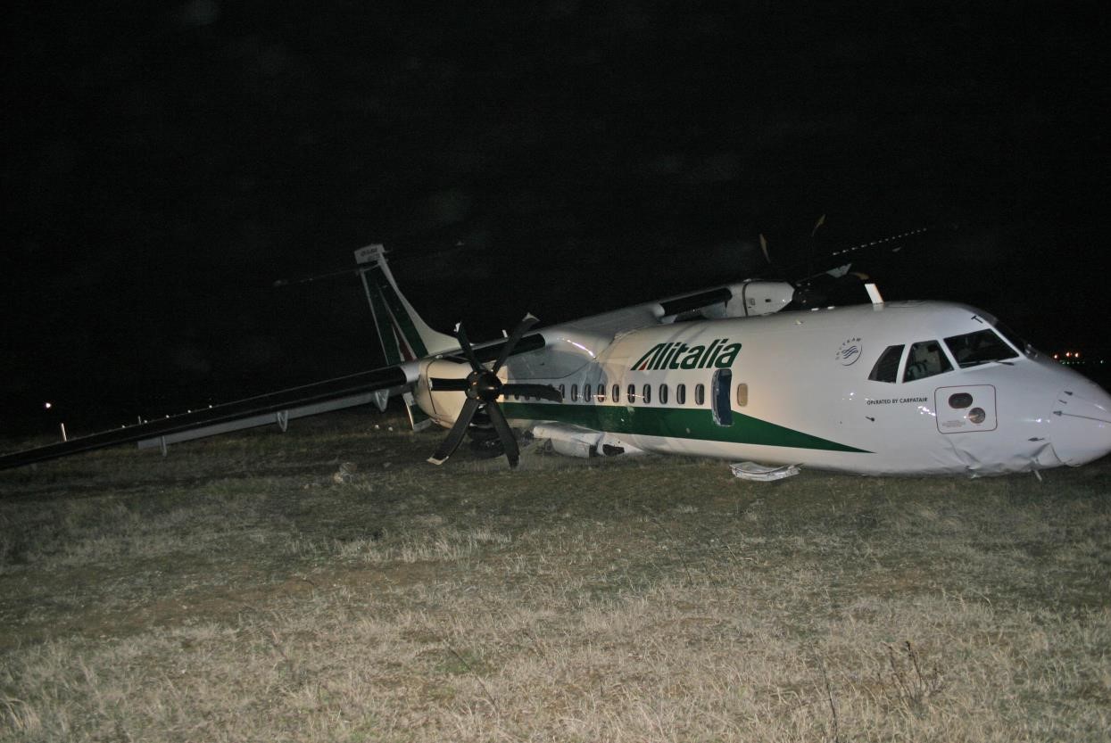 On 2 February 2013, the crew of an ATR 72-500 (YR-ATS) being operated by Carpatair under contract to Alitalia on a scheduled domestic passenger flight from Pisa to Rome Fiumicino as AZ1670 lost control of their aircraft during a crosswind landing on runway16L at destination after making a stable ILS approach in night VMC. A series of four bounces resulted in failure of the landing gear and the departure of the aircraft from the runway before it came to a stop 30 metres from it facing the direction of the approach. Seven of the 50 occupants sustained minor injuries but the very significant damage to the aircraft made it an automatic hull loss.