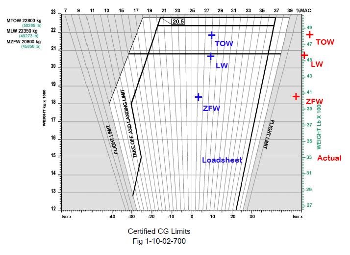 The permitted Flight Envelope showing the Loadsheet (blue) and Actual (red) weights. [Reproduced from the Official Report]